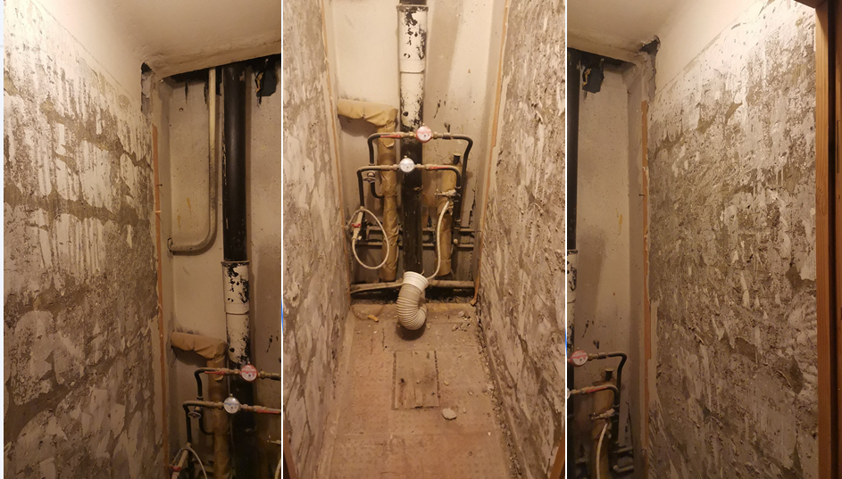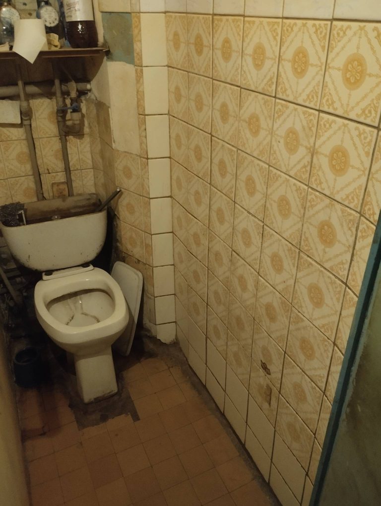 На фото ниже, в туалетной комнате городской квартиры, был произведён демонтаж облицовочной плитки со стен и пола, под дальнейшую укладку новой керамической плитки. С соответствующими операциями по выравниванию и подготовке стен под облицовку. Квартира в брежневке, санузел совмещённый.
